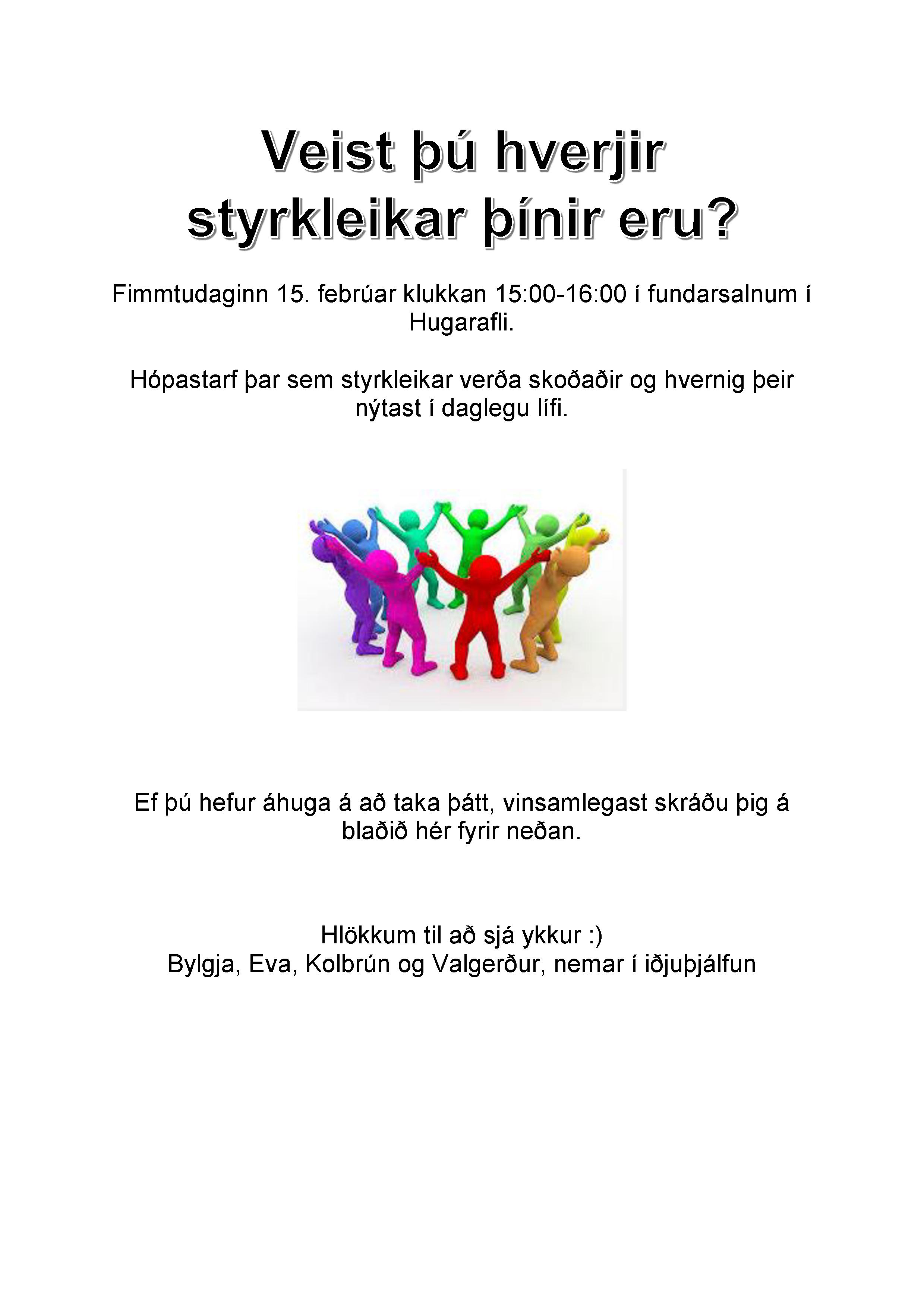 Næstkomandi fimmtudag, 15. febrúar, koma 3. árs iðjuþjálfanemar í heimsókn í Hugarafl og leiða okkur í gegnum hópastarf byggt á styrkleikum og jákvæðri nálgun. Allt Hugaraflsfólk boðið velkomið – þetta er kjörið tækifæri til að eiga skemmtilega stund saman og gefa svo upprennandi fagaðilum endurgjöf til að læra af.